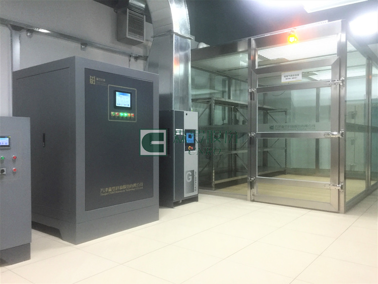 2017年,森羅公司為海南省博物館研制了“低氧氣調(diào)儲藏柜”,五臺氣密儲藏柜共用一套制氮檢控裝置,滿足不同材質(zhì)文物濕度、氧含量參數(shù)的獨立調(diào)控,實現(xiàn)文物分類儲藏。