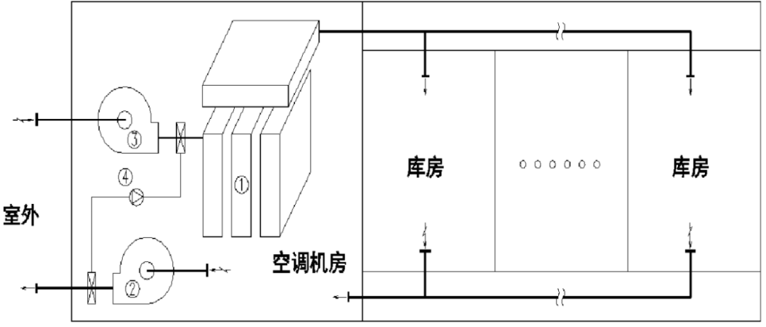 現(xiàn)狀庫內(nèi)僅設(shè)置排風風機,未設(shè)新風風機,空調(diào)新風閥和排風風機常年不開啟且設(shè)計排風量遠小于新風量。另外地庫內(nèi)空調(diào)新、排風分別通過較長的土建風道接至室外,風路阻力大,因此庫內(nèi)引入新風量有限,庫內(nèi)缺乏新風導致人員有憋悶感。改造時考慮按設(shè)計新風量增設(shè)助理新風機,同時更換排風風機,使排風量達到新風量的80%。運行時新、排風風機與空調(diào)機組聯(lián)動,并能根據(jù)室外空氣含濕量情況變頻以減少新風量引入,維持庫內(nèi)溫濕度恒定。
