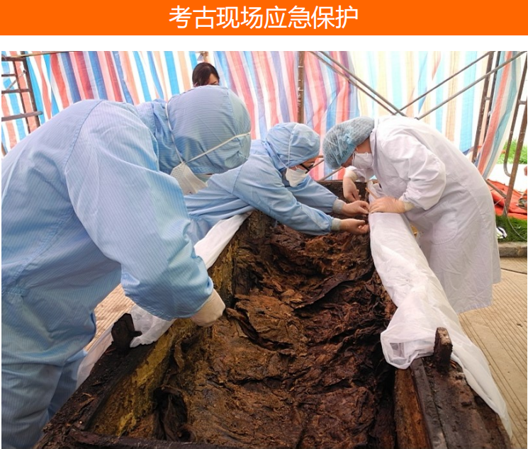 南方多雨,五月份的江浙一帶被雨水浸泡。所以我們?cè)谂R時(shí)搭建的雨棚里面開(kāi)棺,文物保護(hù)接力棒就從考古隊(duì)員手里轉(zhuǎn)到了紡織品科研工作者的手中。