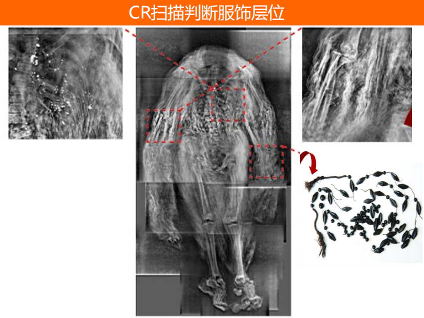 然后,對(duì)整個(gè)尸身的服飾層面做了CR掃描,發(fā)現(xiàn)了大量的高光點(diǎn)——水銀。水銀處理是墓葬常用的防腐措施,但對(duì)文物保護(hù)工作者是有害的,因此,做了相應(yīng)的防護(hù)措施。