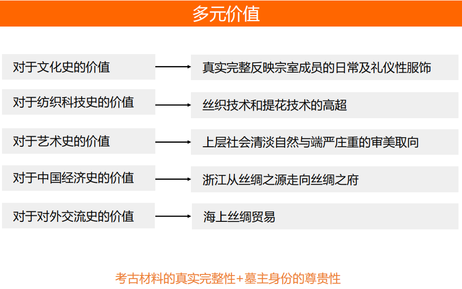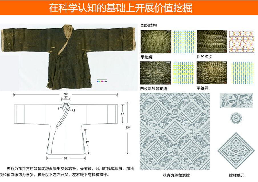 對(duì)于紡織品文物來(lái)說(shuō),首先要知道服飾的組織結(jié)構(gòu)以及面料上的紋樣,探索紋樣蘊(yùn)含著什么樣的時(shí)代特征?反映了墓主人什么樣的審美意趣?這些服飾形式以及穿著層次含義是什么?這些都是我們要進(jìn)行的價(jià)值挖掘內(nèi)容。