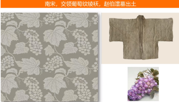 “葡萄紋”是一種傳統(tǒng)的吉祥紋樣,象征著豐收、富饒和多子多福。在中國(guó)文化中,葡萄因其豐碩的果實(shí)和繁茂的藤蔓,常被用來(lái)象征繁榮和延續(xù)后代。南宋時(shí)期的服飾中,葡萄紋作為當(dāng)時(shí)流行的裝飾元素之一,受到人們的喜愛(ài)。