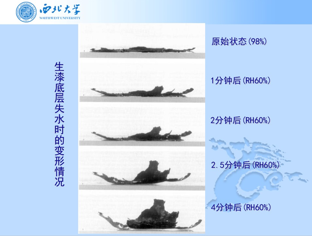 秦兵馬俑實驗室采用秦俑出土后脫落的漆皮進行實驗,發(fā)現(xiàn)在60%RH時,只需要四分鐘左右,就可以看到明顯的起皮變形,說明短時間內(nèi)環(huán)境突變可以造成漆皮的變化。