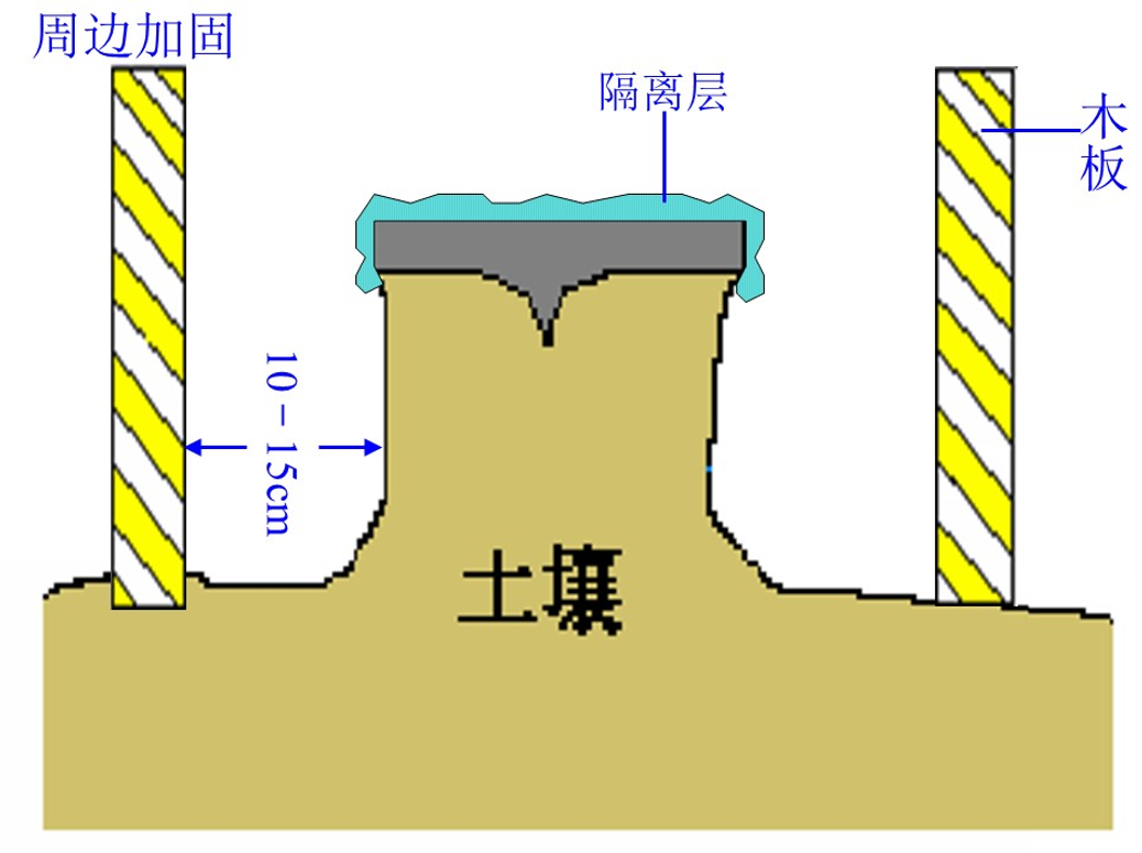 隔離處理完成后,我們做了一個木質(zhì)框架,比土質(zhì)臺基要寬很多。對木質(zhì)框架底層進行填土處理,因為實際地面并不平整,填土可防止灌注聚氨酯液體時發(fā)生外溢。