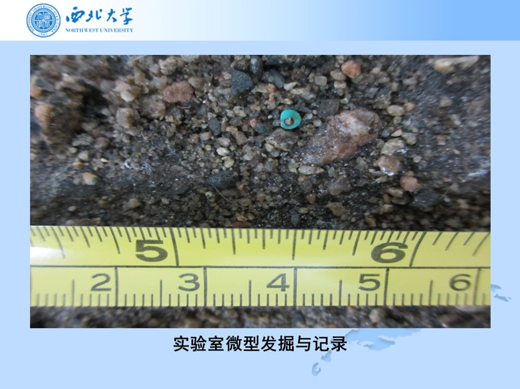 通過在實驗室做微型發(fā)掘過程的照片記錄,可以看到這是一個綠松石小珠子,就是幾毫米左右。如果在現(xiàn)場去做清理,光線特別不好的情況下,很有可能就把它當(dāng)石頭清理掉了。