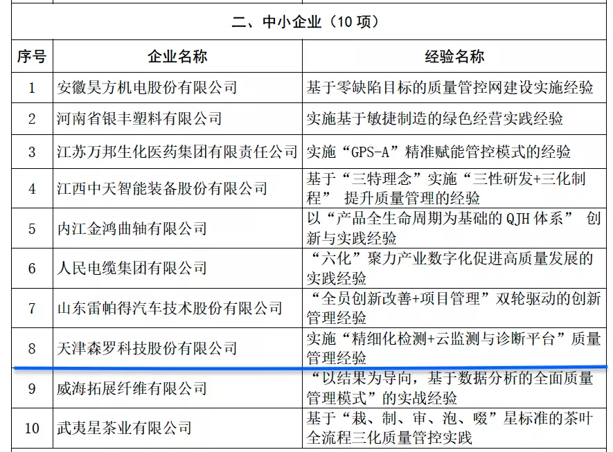 2021-10-25受工業(yè)和信息化部委托,中國質(zhì)量協(xié)會(huì)發(fā)布2021年全國質(zhì)量標(biāo)桿遴選結(jié)果,認(rèn)定48項(xiàng)工業(yè)企業(yè)產(chǎn)業(yè)基礎(chǔ)能力提升、數(shù)字化與智能化、質(zhì)量管理等領(lǐng)域的典型經(jīng)驗(yàn),10項(xiàng)中小企業(yè)、6項(xiàng)服務(wù)業(yè)企業(yè)典型經(jīng)驗(yàn)為2021年全國質(zhì)量標(biāo)桿。天津森羅科技股份有限公司的“精細(xì)化檢測(cè)+云監(jiān)測(cè)與診斷平臺(tái)”質(zhì)量管理經(jīng)驗(yàn)榮獲全國質(zhì)量標(biāo)桿,本年度獲此殊榮的全國中小企業(yè)僅有10家。