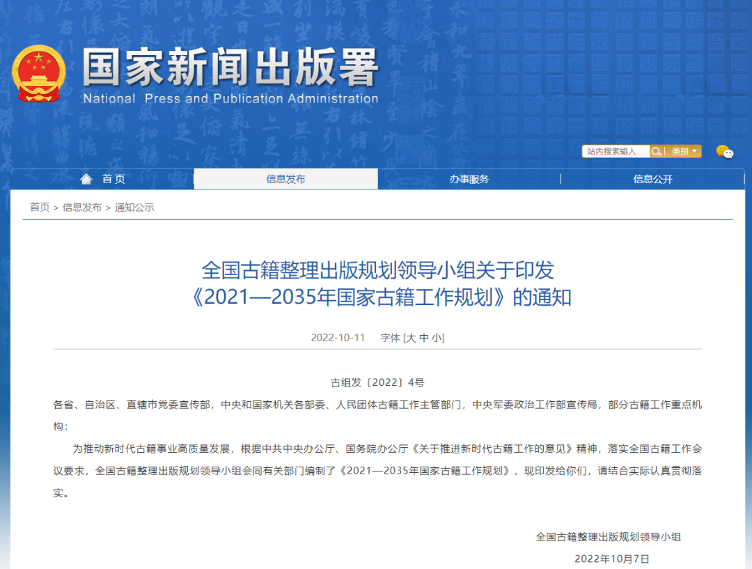 為推動(dòng)新時(shí)代古籍事業(yè)高質(zhì)量發(fā)展,根據(jù)中共中央辦公廳、國(guó)務(wù)院辦公廳《關(guān)于推進(jìn)新時(shí)代古籍工作的意見(jiàn)》精神,落實(shí)全國(guó)古籍工作會(huì)議要求,全國(guó)古籍整理出版規(guī)劃領(lǐng)導(dǎo)小組會(huì)同有關(guān)部門(mén)編制了《2021—2035年國(guó)家古籍工作規(guī)劃》,現(xiàn)印發(fā)給你們,請(qǐng)結(jié)合實(shí)際認(rèn)真貫徹落實(shí)。