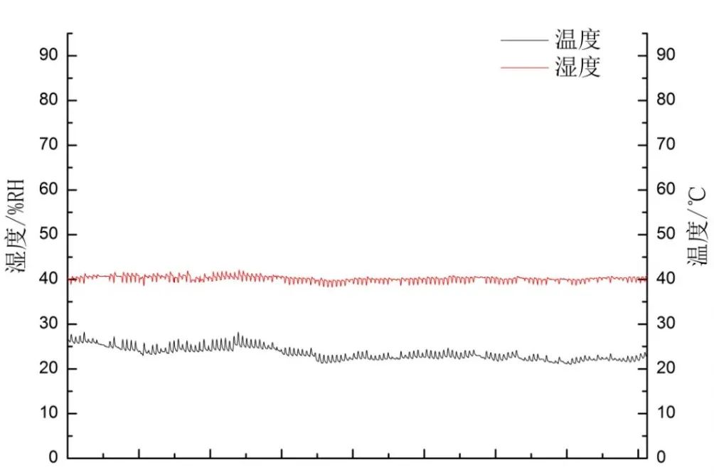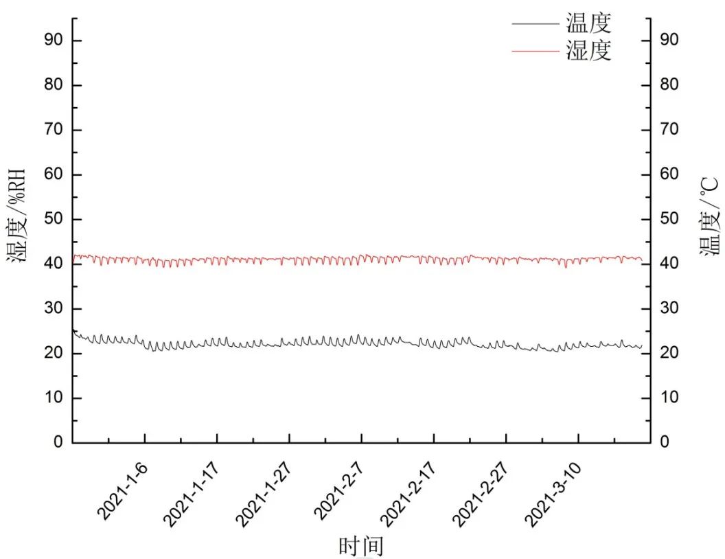 柜內(nèi)配置了由天然植物纖維和高分子材料組成的恒濕模塊,并將濕度設(shè)定在適合古籍儲存的40%RH,根據(jù)無線溫濕度傳感器的數(shù)據(jù)顯示,在四個(gè)多月的時(shí)間內(nèi),兩臺儲藏柜內(nèi)的濕度雖略有差異,但均在目標(biāo)值的±5%以內(nèi),且穩(wěn)定性極好。