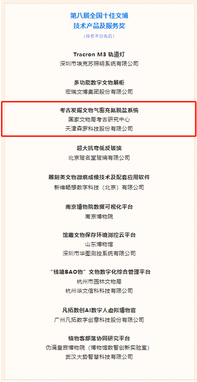 經(jīng)過終評(píng)委員會(huì)專家專業(yè)的評(píng)議討論,由國家文物局考古研究中心、天津森羅科技股份有限公司聯(lián)合申報(bào)的考古發(fā)掘文物氣密充氮脫鹽系統(tǒng),榮獲了第八屆全國十佳文博技術(shù)產(chǎn)品及服務(wù)獎(jiǎng)。常壓低氧氣調(diào)殺蟲系統(tǒng)。
