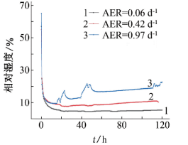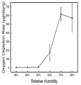 實驗表明,濕度≤10%基本無化學(xué)腐蝕,受氧濃度影響較小。從相對濕度與氧消耗速率曲線可以看出,隨濕度的增加,氧消耗(電化學(xué)腐蝕)速率加快。