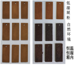將預(yù)腐蝕鐵片分別置于低濕展柜、自然環(huán)境(50%~80%RH)和恒濕箱(80%RH)內(nèi)進行對比試驗時發(fā)現(xiàn):環(huán)境濕度增加,表面銹層增厚,銹蝕產(chǎn)物顏色加深,腐蝕嚴(yán)重。同時,實驗也證實:穩(wěn)定、低濕(低氧)的密封環(huán)境,能夠有效減緩鐵試片的腐蝕。