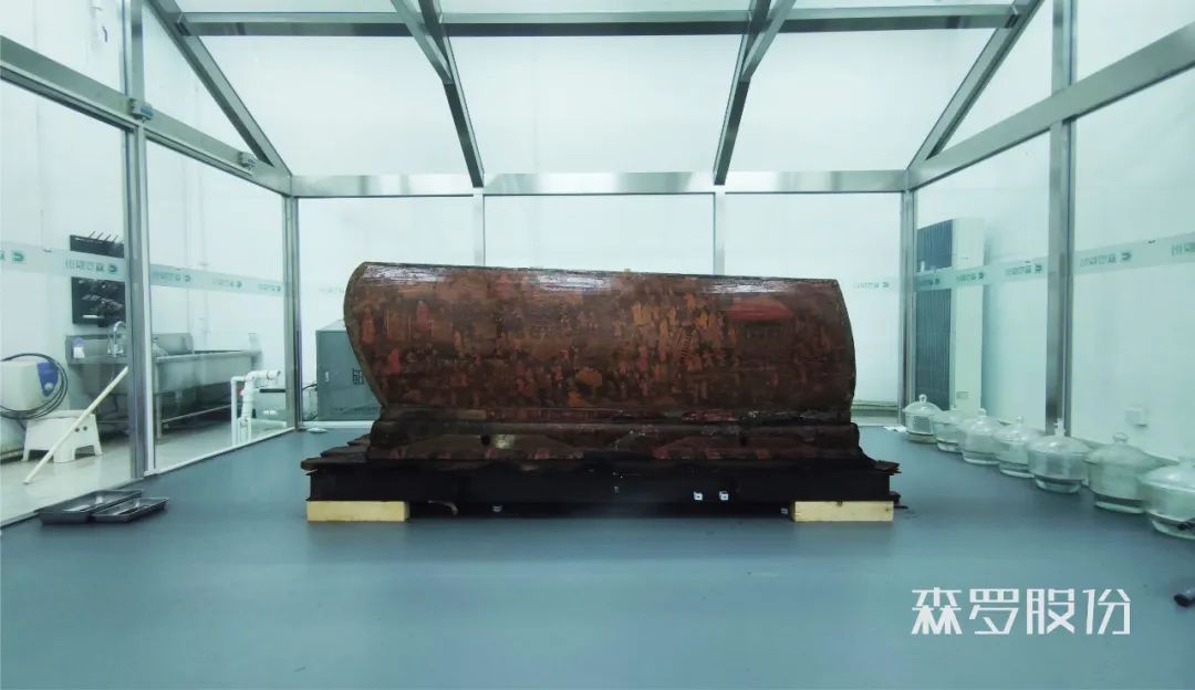 在北京五里坨出土明代描金彩繪棺槨的脫水保護中,森羅股份與首都博物館合作,應(yīng)用“文物精準(zhǔn)控濕脫水系統(tǒng)”,通過精準(zhǔn)控制環(huán)境與文物間的濕度差,間接控制飽水文物水分蒸發(fā)速率,避免因蒸發(fā)太快導(dǎo)致的文物變形干裂。