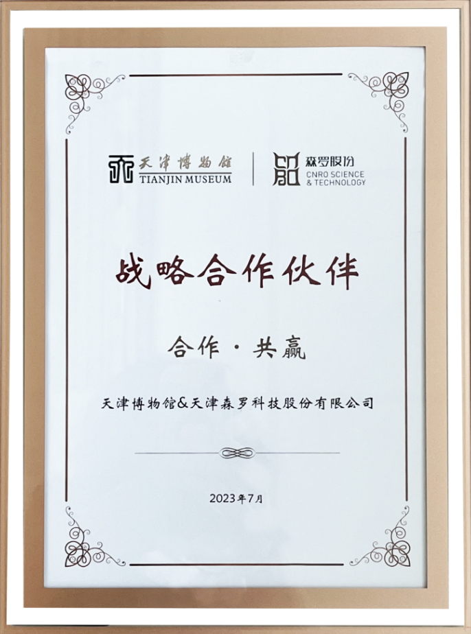 百年博物館的發(fā)展,也離不開博物館產(chǎn)業(yè)合作伙伴的共同努力。天津博物館與森羅股份達(dá)成戰(zhàn)略合作伙伴關(guān)系,并頒發(fā)證書。