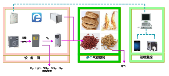 森羅股份智能低氧氣調(diào)養(yǎng)護(hù)技術(shù),簡(jiǎn)單來說,就是以高潔凈氮?dú)庵脫Q氣密庫房中原有的空氣,并通過檢控設(shè)備長(zhǎng)期維持空間中氧含量、溫濕度穩(wěn)定性,從而達(dá)到中藥材氣調(diào)殺蟲與長(zhǎng)期養(yǎng)護(hù)目的。