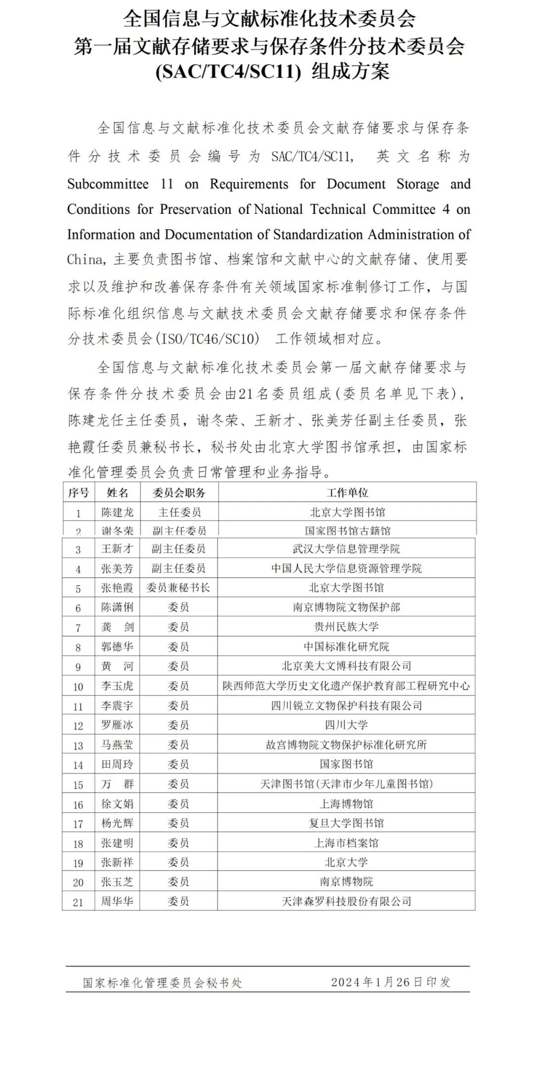 天津森羅科技股份有限公司首席技術(shù)官周華華,作為圖書館、檔案館和文獻(xiàn)中心的文獻(xiàn)保存環(huán)境技術(shù)專業(yè)人士榮幸入選分委會,成為全國信息與文獻(xiàn)標(biāo)準(zhǔn)化技術(shù)委員會第一屆文獻(xiàn)存儲要求與保存條件分技術(shù)委員會21名委員之一。