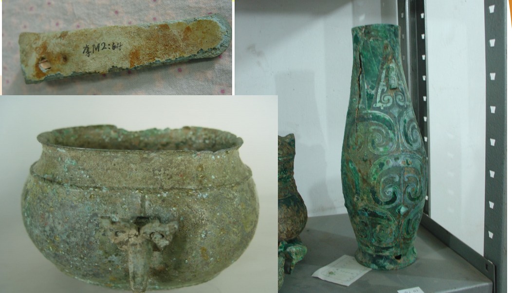 下圖中左上是云南李家山出土的青銅器。因?yàn)橥寥赖乩憝h(huán)境的因素,導(dǎo)致青銅器表面結(jié)構(gòu)非常疏松脆弱,造成青銅器掉渣,這是一種典型的病害特征。右圖所示是山西出土的文物,它的裂隙有變大的趨勢(shì)裂隙,這也導(dǎo)致整個(gè)青銅本體的脆弱、腐蝕。左下圖它表面有一些藍(lán)綠色小點(diǎn),當(dāng)保存環(huán)境潮濕時(shí),這些小點(diǎn)會(huì)大量地產(chǎn)生。
