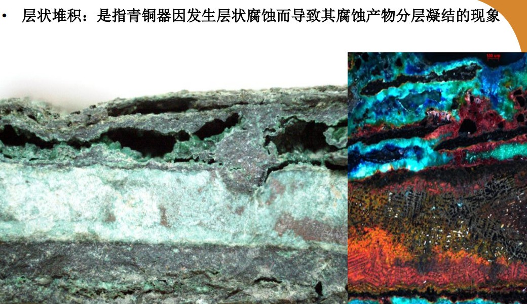 下圖是青銅器表面的結(jié)構(gòu),它的腐蝕層是分層的,中間有孔洞,還有其他不同狀態(tài)的銹蝕。這種銹蝕產(chǎn)物的凝結(jié)會(huì)加重青銅器本體的腐蝕。
