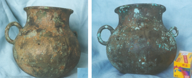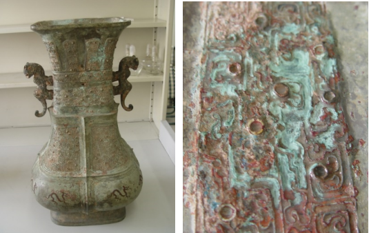 下圖所示的青銅鼎是典型的青銅病案例。在比較潮濕的環(huán)境下,局部產(chǎn)生大量的銹蝕,體積膨脹。如果處理保護(hù)不及時(shí),對(duì)環(huán)境不進(jìn)行控制,銹蝕會(huì)不斷地產(chǎn)生并繼續(xù)腐蝕青銅鼎的本體,造成非常重大的損害。