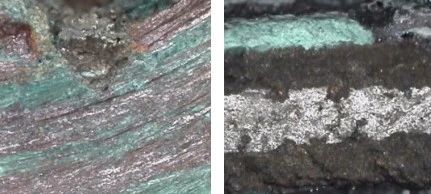 “青銅病”的銹蝕產(chǎn)物是“粉狀銹”,常常是從頂部覆蓋的礦化物裂縫中冒出來(lái)的;