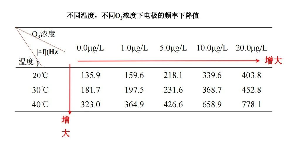 如下圖所示,通過(guò)測(cè)試不同溫度、不同臭氧濃度下電極頻率下降值,發(fā)現(xiàn):隨著溫度的上升、臭氧濃度的增大,青銅材料腐蝕速率明顯增大。