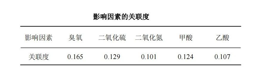 1)關(guān)聯(lián)度由大到小依次為:臭氧>二氧化硫>甲酸>乙酸>二氧化氮;
