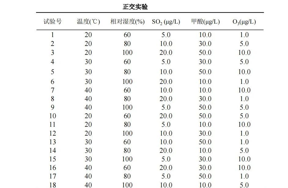 2)采用正交實(shí)驗(yàn)法,測(cè)試了不同溫濕度、不同濃度污染性氣體對(duì)青銅材料腐蝕的影響??紤]到環(huán)境溫度、相對(duì)濕度會(huì)對(duì)反應(yīng)速率等造成影響。因此,選擇溫度、相對(duì)濕度、臭氧、二氧化硫、甲酸作為青銅腐蝕的主要影響因素進(jìn)行實(shí)驗(yàn)。