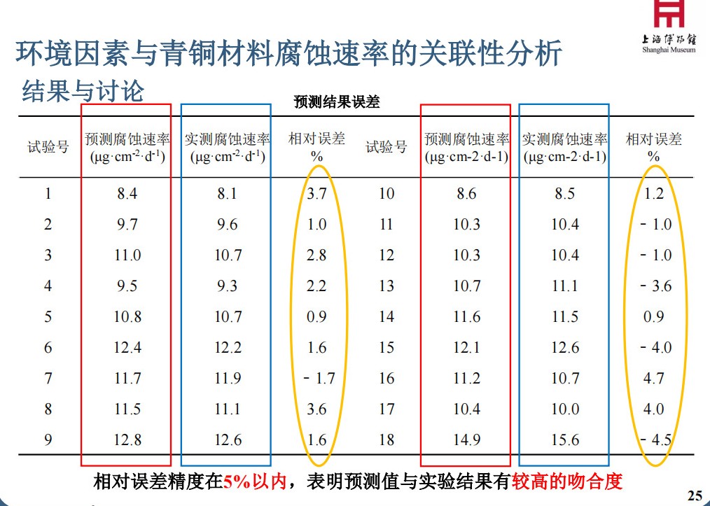 按照正交實(shí)驗(yàn)推導(dǎo)的腐蝕公式模型,進(jìn)一步推導(dǎo)的腐蝕因子占比的關(guān)聯(lián)模型。應(yīng)用該模型預(yù)測(cè)環(huán)境因素對(duì)青銅腐蝕概率,模型預(yù)測(cè)值與實(shí)驗(yàn)結(jié)果有較高的吻合度,相對(duì)誤差精度5%以內(nèi)。這也表明,環(huán)境因素與青銅材料腐蝕速率關(guān)聯(lián)性模型是比較成功的。