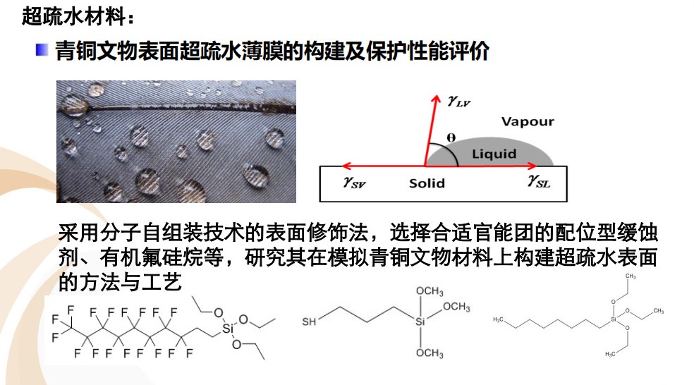 在青銅表面局部構(gòu)建一個(gè)超疏水區(qū)域后,水膜不容易形成,這樣青銅器局部有害銹的繼續(xù)發(fā)生概率會(huì)大大減弱,從而對(duì)青銅器起到一個(gè)非常長(zhǎng)久和穩(wěn)定的保護(hù)作用。