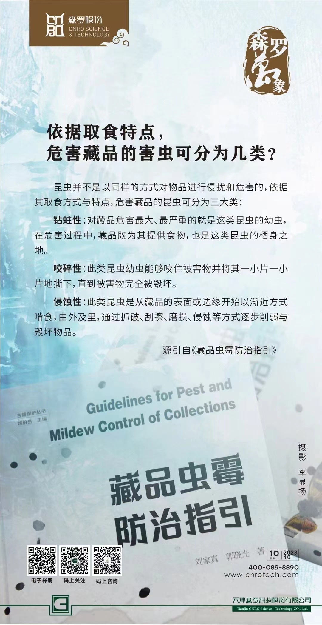 《森羅萬象》,萬象包羅。第49問依據(jù)取食特點,危害藏品的害蟲可分為幾類?了解館藏害蟲相關(guān)信息,探索0污染、0殘留、0損傷的殺蟲方法,掃碼私信“森羅小助手”,期待與您共同解鎖更多蟲霉防治知識。
