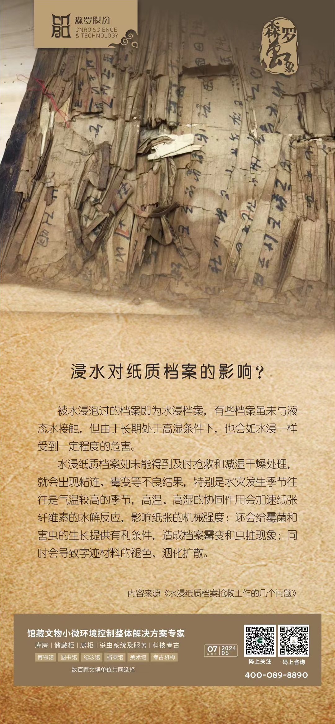 《森羅萬(wàn)象》,萬(wàn)象包羅。第77問(wèn) 浸水對(duì)紙質(zhì)檔案的影響? 覓卷以求知之精髓 尋典以明學(xué)之微奧 掃碼私信,與森羅小助手 一起覽藉摘句,探尋智慧之光。