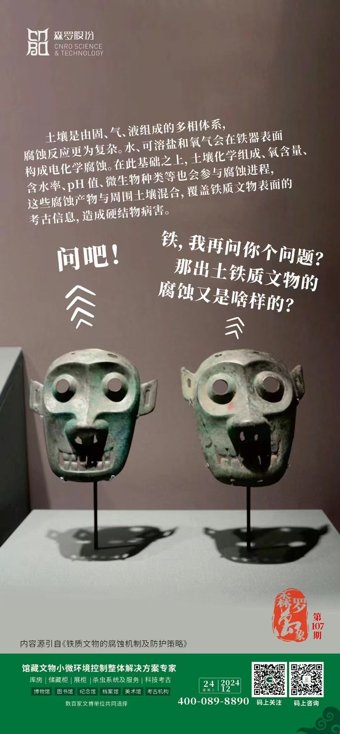 《森羅萬象》萬象包羅。第107問 出土鐵質(zhì)文物的腐蝕是什么樣??土壤中腐蝕反應(yīng)更為復(fù)雜;?腐蝕產(chǎn)物易造成硬結(jié)物病害。掃碼“森羅小助手”與您攜手探索知識之旅